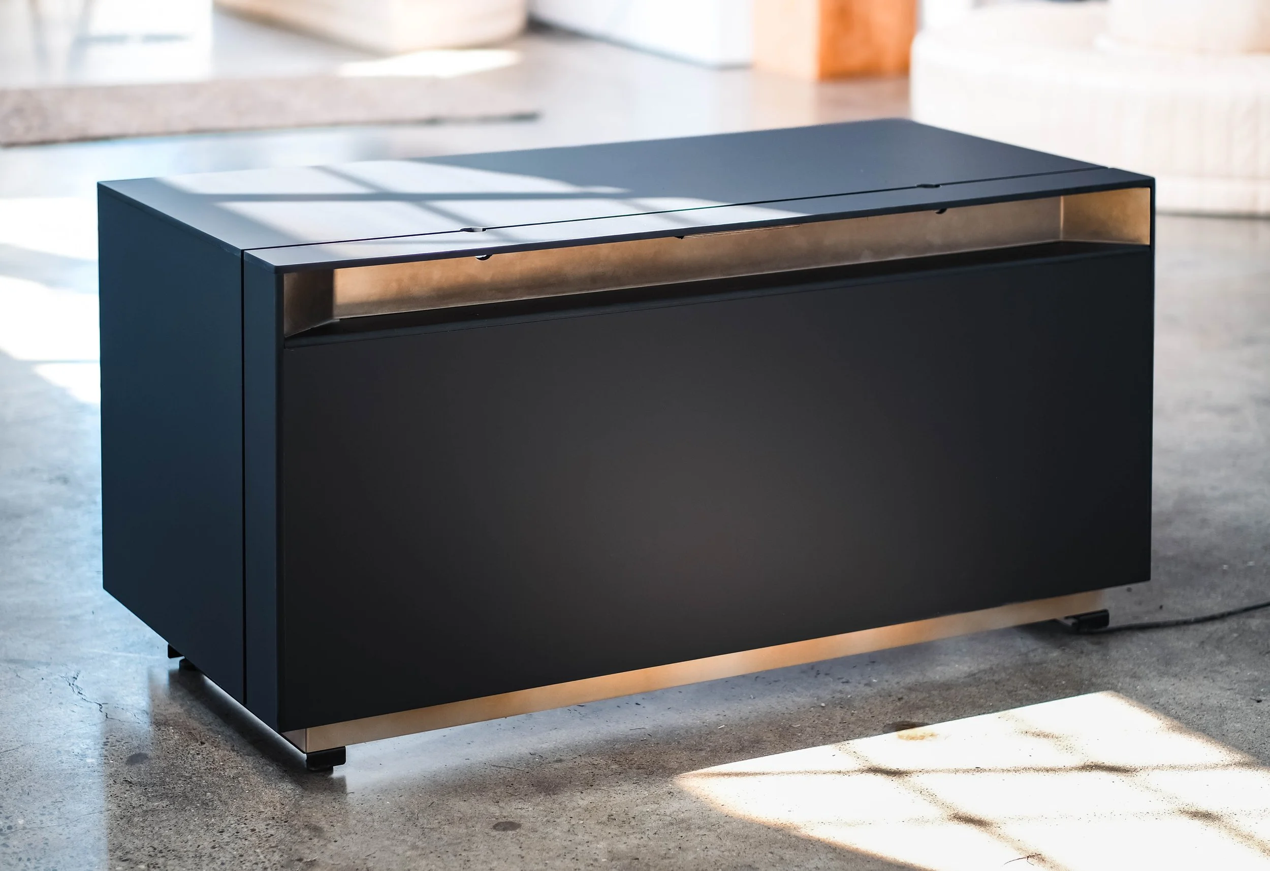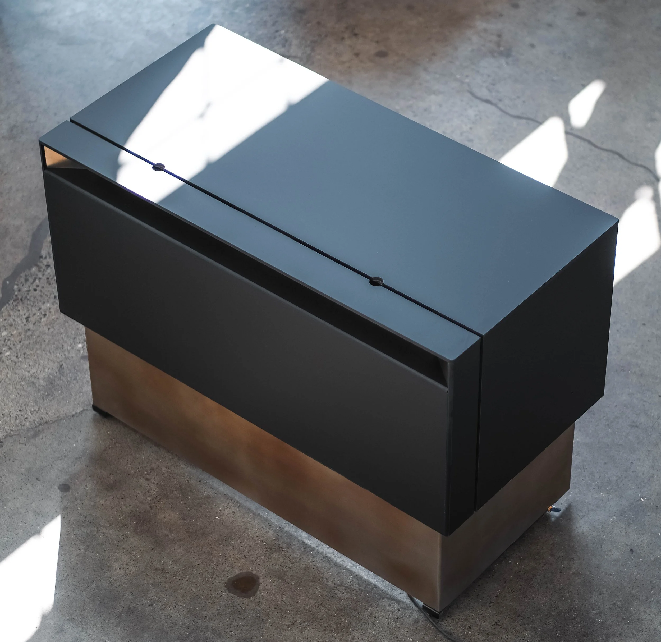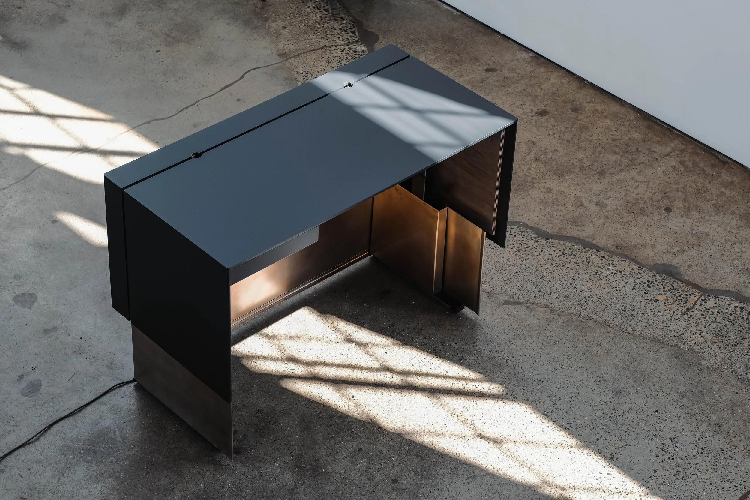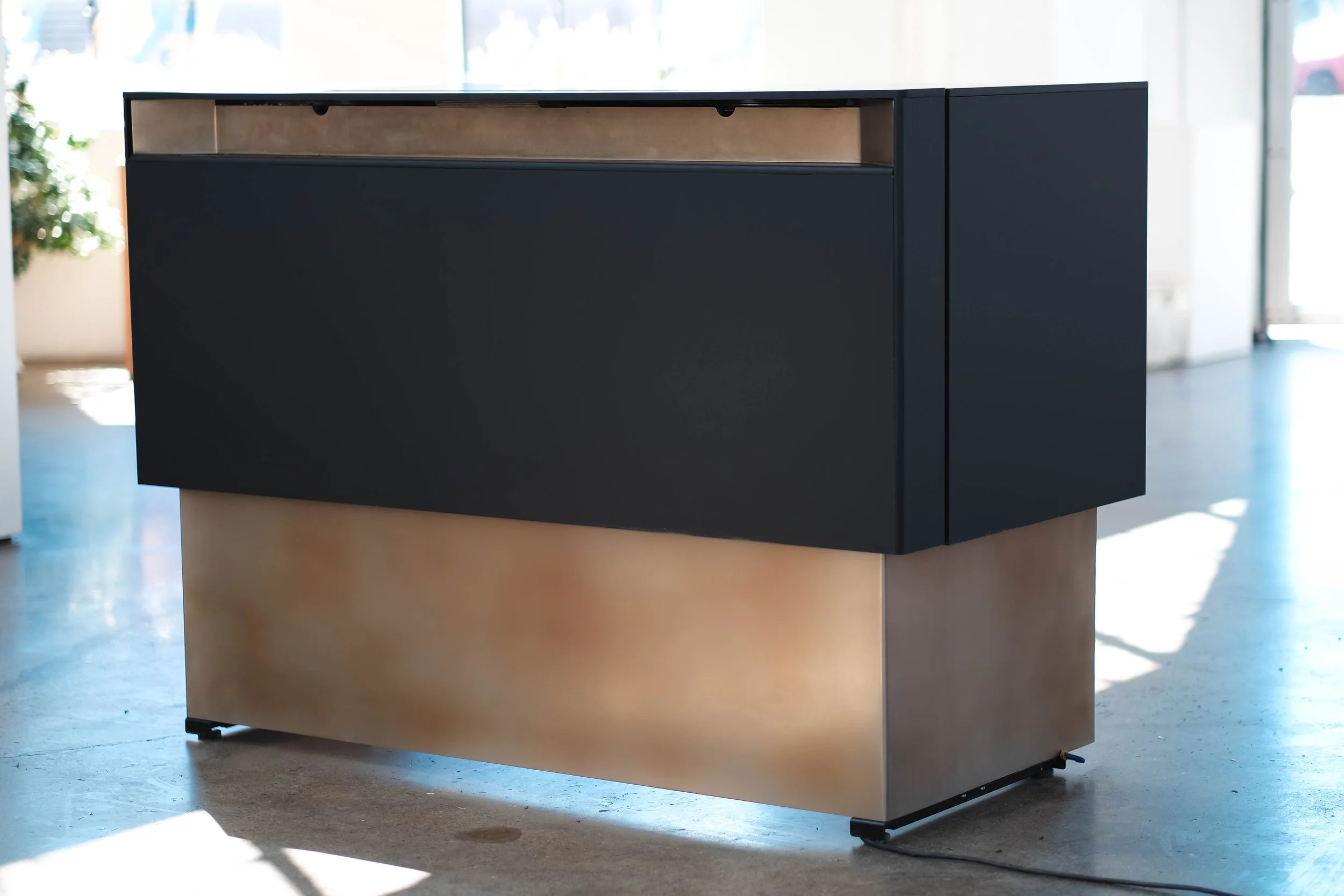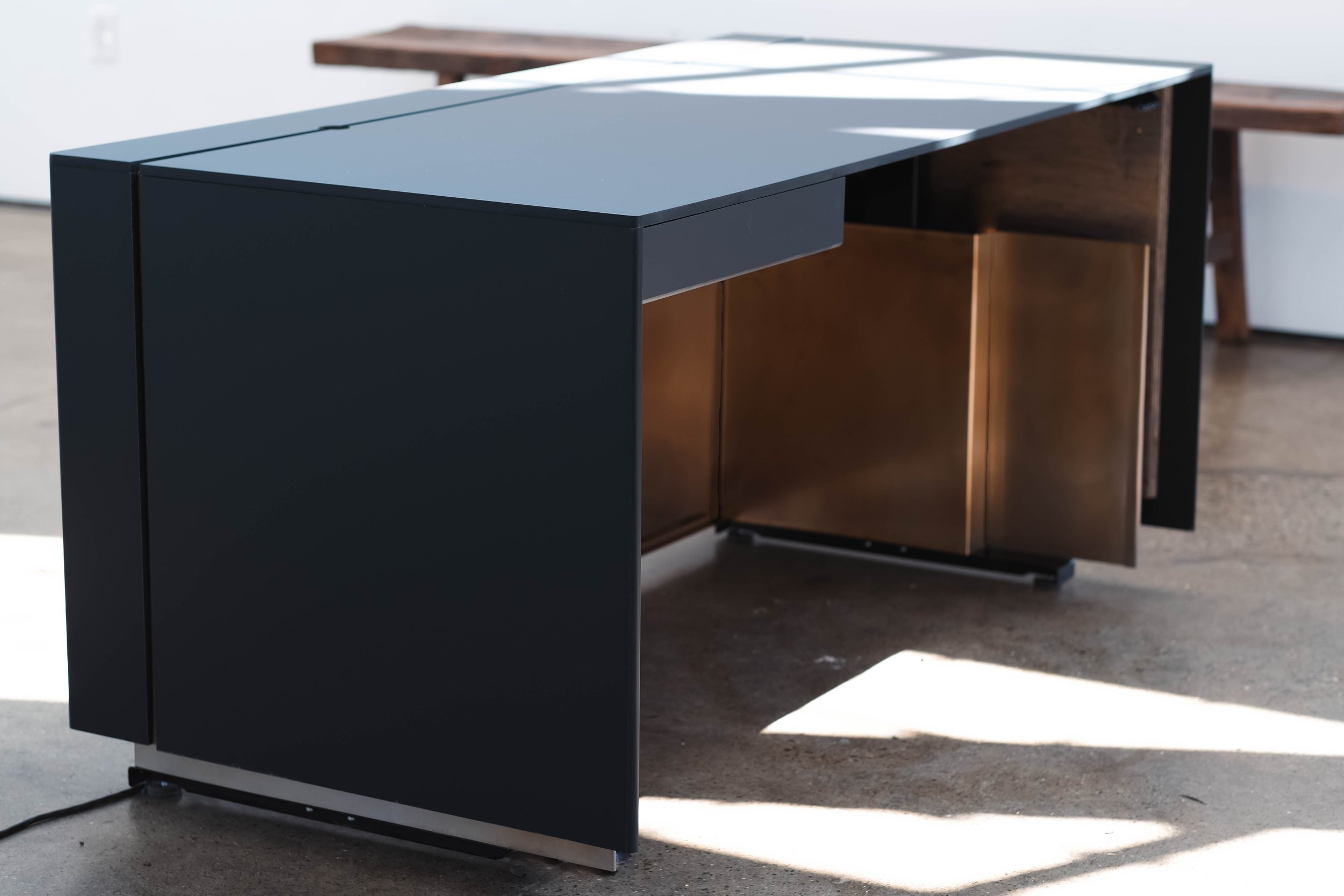 Mutuus Studio was commissioned to design a sit-stand desk that met our clients specific needs. We sought to incorporate our Mutuus Made signature torched stainless material into an elegant shroud for our client. Fenix anti-bacterial material was machined to create an elegant cord solultion. Fabricated in our Mutuus Made shop in Georgetown we were able to oversee every detail to meet our clients needs. Every detail was considered to create this timeless desk.Design Team: Mutuus Made: Saul Becker, Jon McAllister. Fabrictation team: Jon McAllister - Mutuus Made