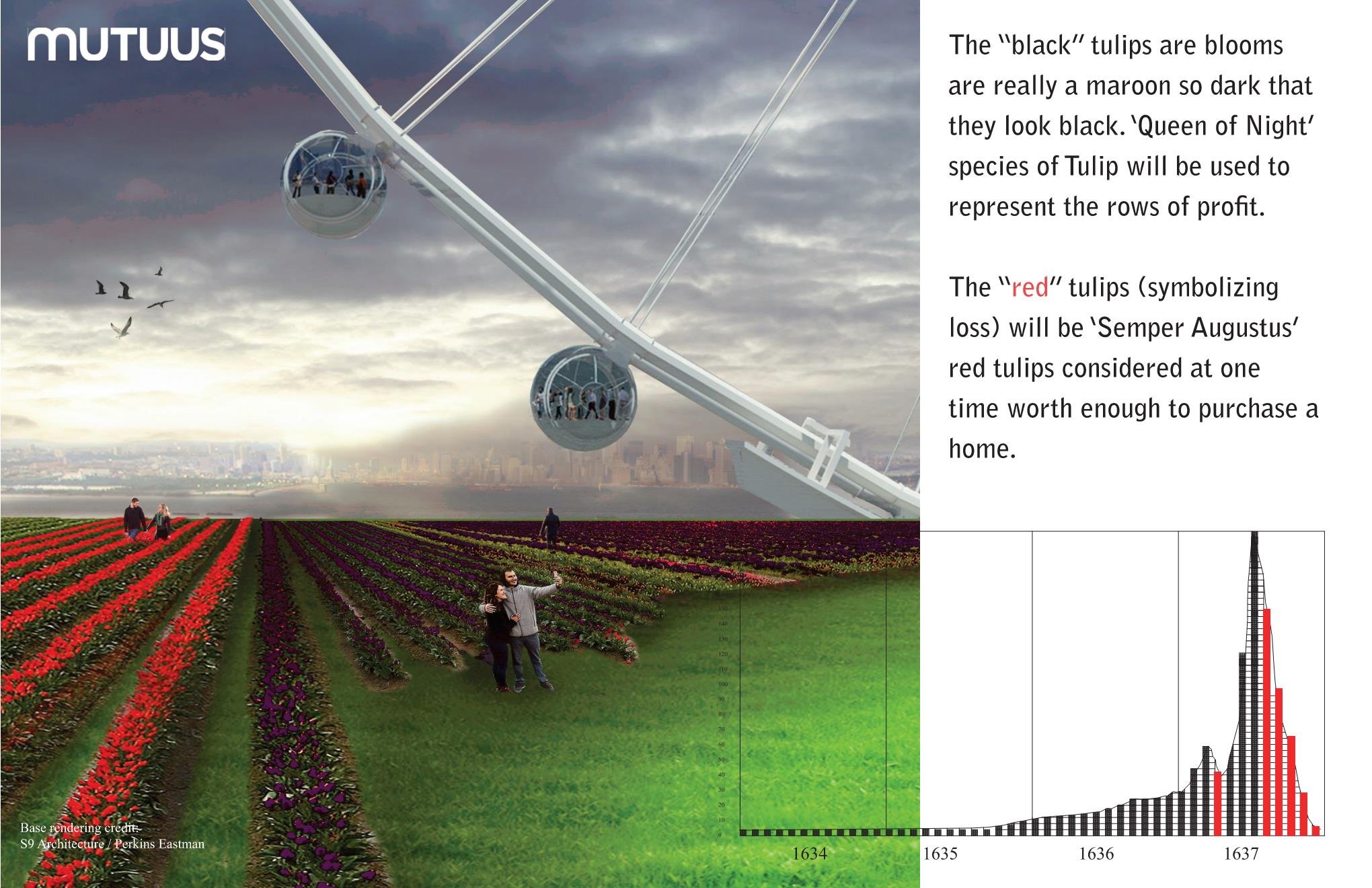 Tulip Mania was a period in the Dutch Golden Age during which contract prices for bulbs of the recently introduced tulip reached extraordinarily high levels and then dramatically collapsed in February 1637. Our proposal seeks to make a large graphic installation made from Tulips showcasing the rise and fall of the Tulip price.